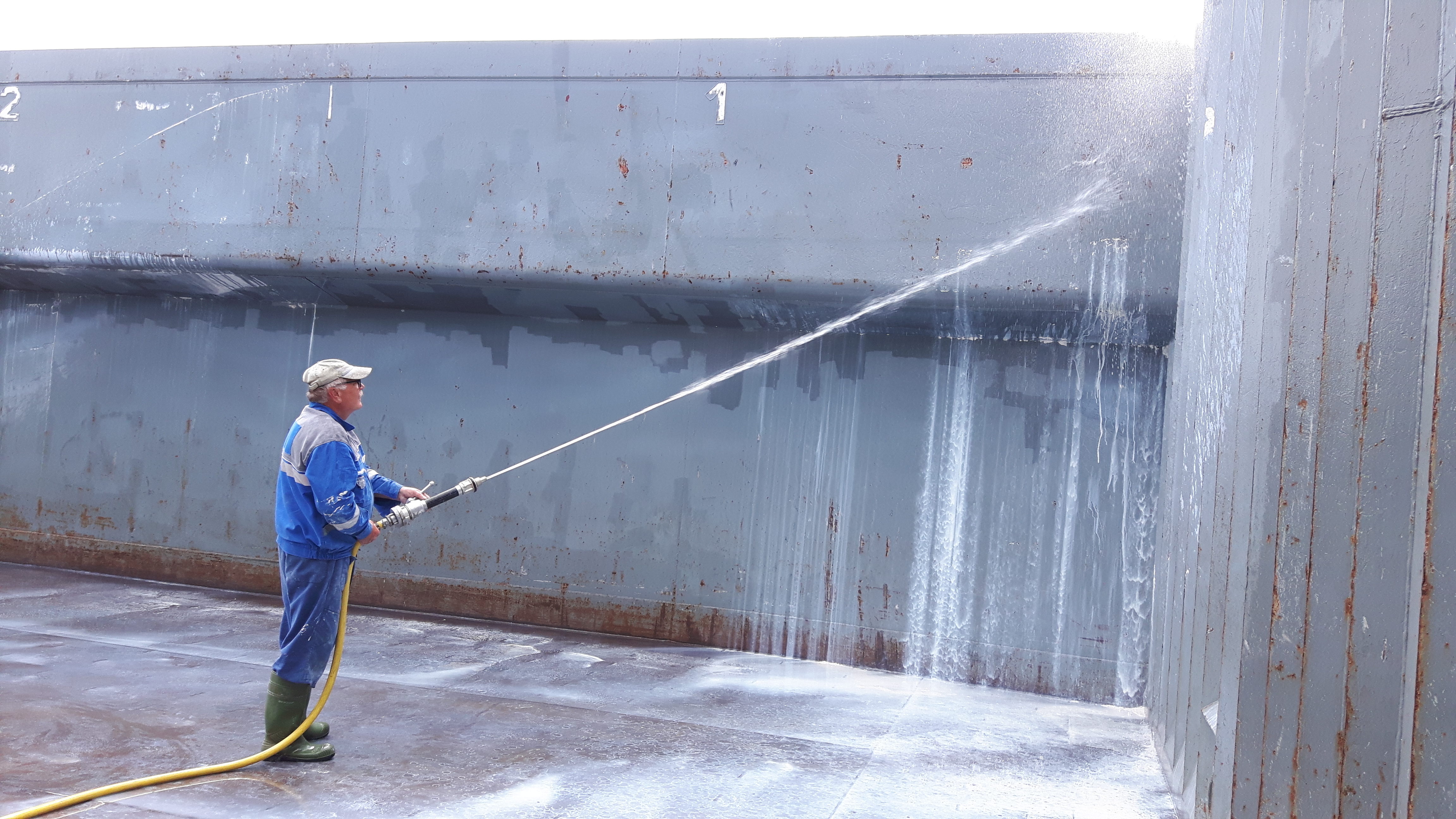 • Na een uur of 9, om half 3 dus, is het stoffige goedje china klei gelost, en kunnen we echt aan de bak. Ofwel: het, wederom, zwaar bestofte dek afspoelen, en het laadruim schoon en globaal droog boenen.