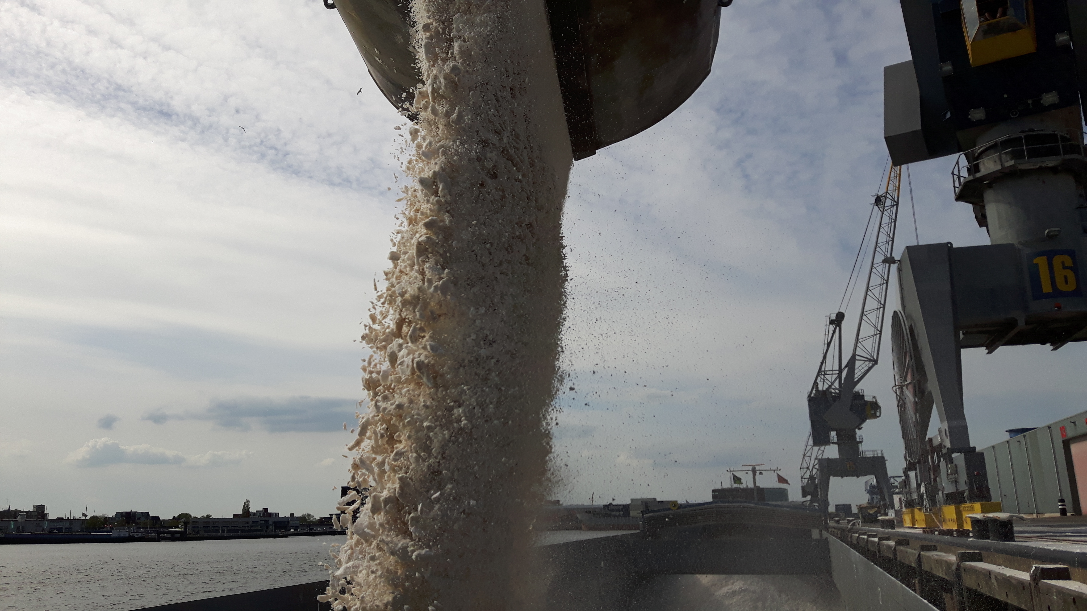 De enorme grijper van de hijskraan plenst de eerste lading (nu dus maar liefst 10 ton ineens!) al in het ruim als wij er nog aan het schoonmaken zijn. Maar oke: dat ruim heeft een lengte van om en nabij de 75 meter, dus we zitten elkaar niet echt in de weg.