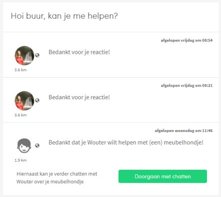 Wel uitsluitend hulp in materiële vorm – helpende handen heb ik momenteel niet over, sorry. Aldus een hele stapel tijdschriften (ter weggeef) aangeboden, en bordspellen te leen. En nog zo een paar huis-tuin-en-keuken dingen. Helaas werd geen enkele keer daadwerkelijk gebruik gemaakt van mijn leen- of weggeefaanbod (na ja, die hulpvragen zullen dan door anderen al voldaan zijn, dus zo helaas uiteindelijk niet). Persoonlijk leverde het mij wel een paar aardige bedankberichtjes terug op, en daarmee, jawel, toch het gevoel Goed Gedaan (op zijn minst dat geprobéérd) te hebben (en das een fijn gevoel toch?). En een licht-hilarische reactie van Peerby ook, overigens. De kans om te chatten over je meubelhondje – daarin toont zich toch zonder twijfel ook de sociale meerwaarde van circulair doen!