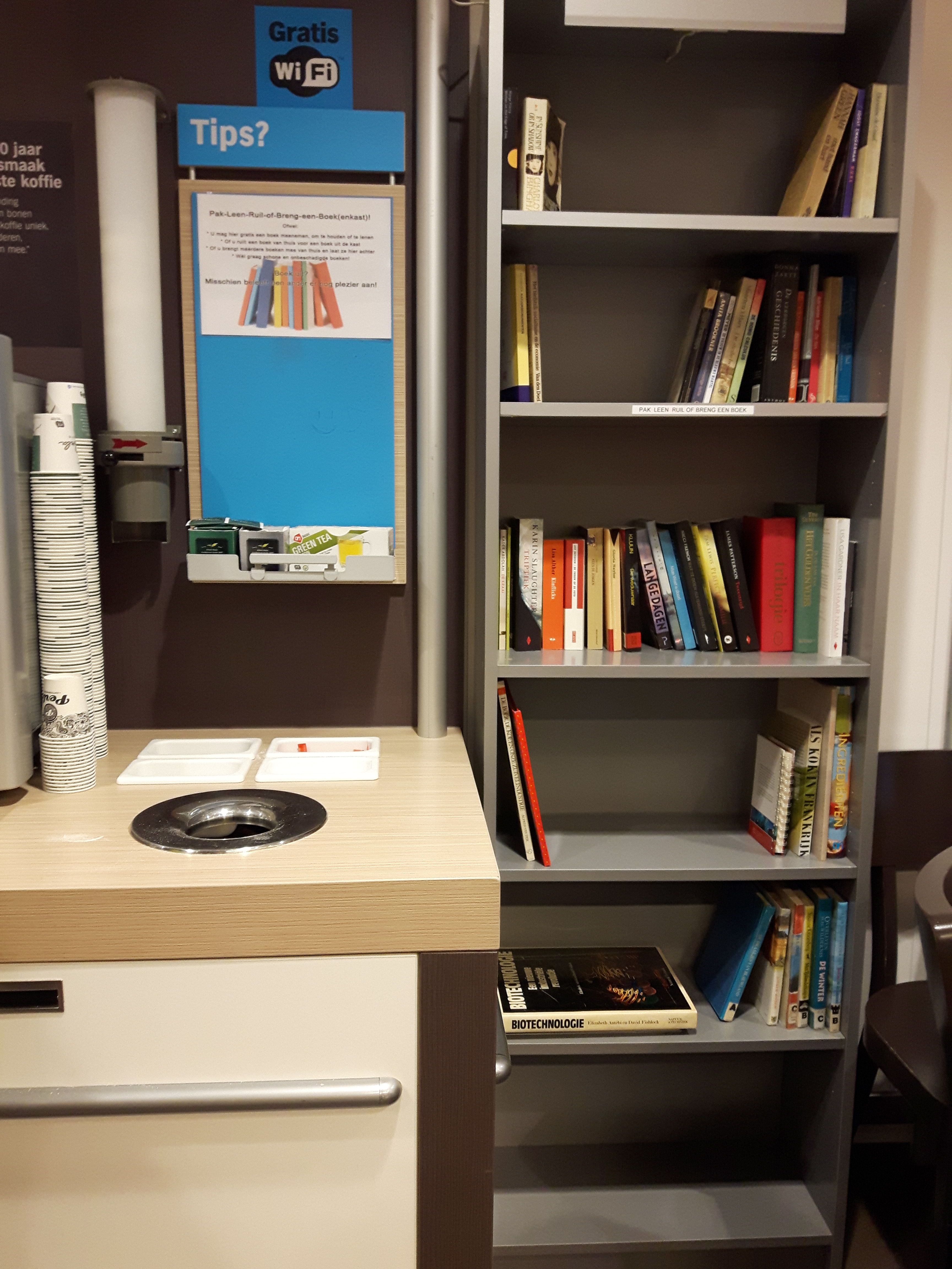 Jawel, sinds een paar weken kan ik weer zonder levensgevaar mijn trap op en af – die is boekenkast af. Want sindsdien koop je in de Albert Heijn aan de Daalseweg in Nijmegen Oost niet alleen je dagelijkse levensmiddelen, maar kan je er ook je (meer) intellectuele honger stillen. Want naast de koffiehoek staat een zogenaamde BoekenRuilKast, met voor elk wat wils aan leesvoer. Een kast dus waaruit jij een boek mag meenemen (of meerdere), om te houden of te lenen. Of om te ruilen voor jouw eigen uitgelezen boek(en). Méér leesplezier per boek dus! Doe je mee?